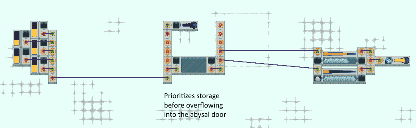 A design for always prioritized storage if possible before overflowing into your preferred "item destruction" method. (it takes a while to unlock the Large Splitters & Mergers, but very worth it). ---- NOTE, if it wasn't obvious, you want the item destruction to be connected LAST on the INPUT-side, NOT the output-side, that would just constantly empty the storage.